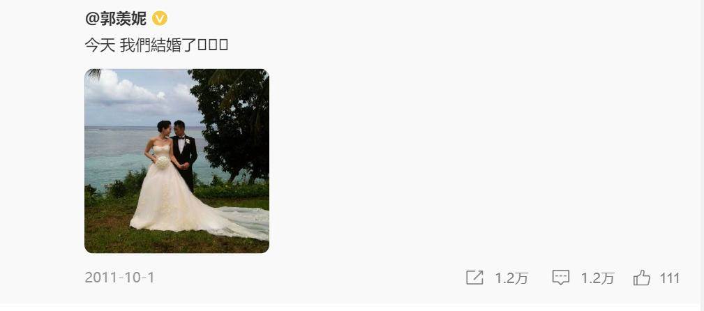 2011年10月1日,郭羨妮和朱少杰低調地完成了婚禮,當天,郭羨妮更是開心地在微博中曬出了結婚照,并配文:今天 我們結婚了!