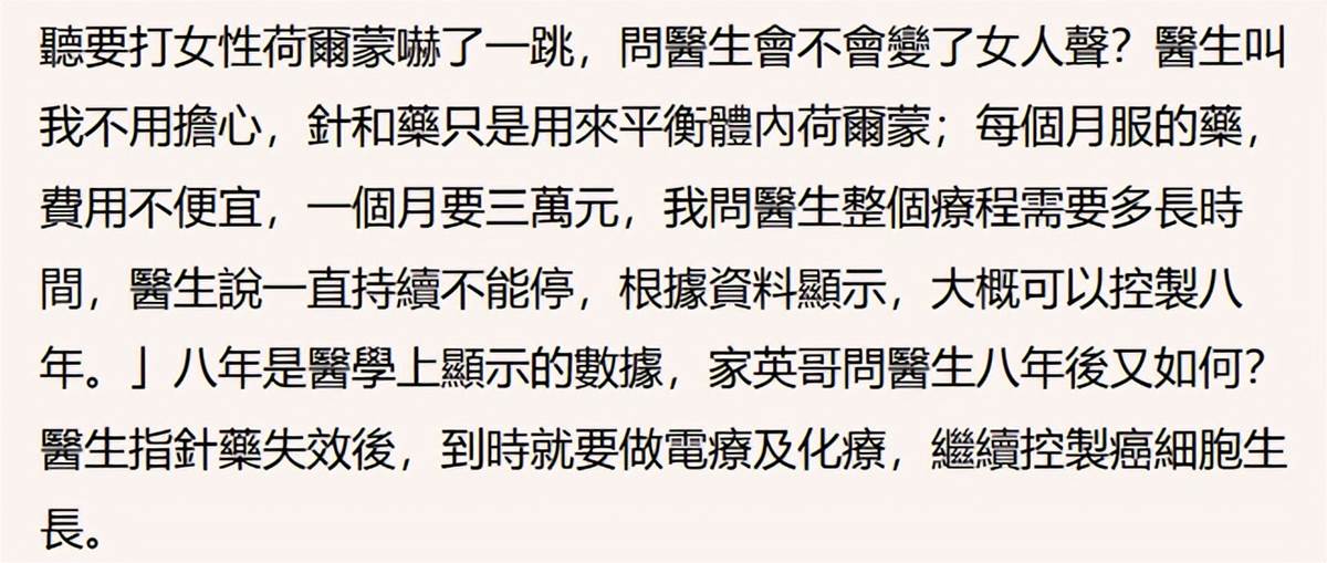 當時醫生就說沒得切了,只能打針吃藥控制,當他聽到要打女性荷爾蒙的針時嚇了一跳,怕自己變成女人,醫生則安慰沒事,不過大概可以控制八年,八年以后可能要做電療或化療。