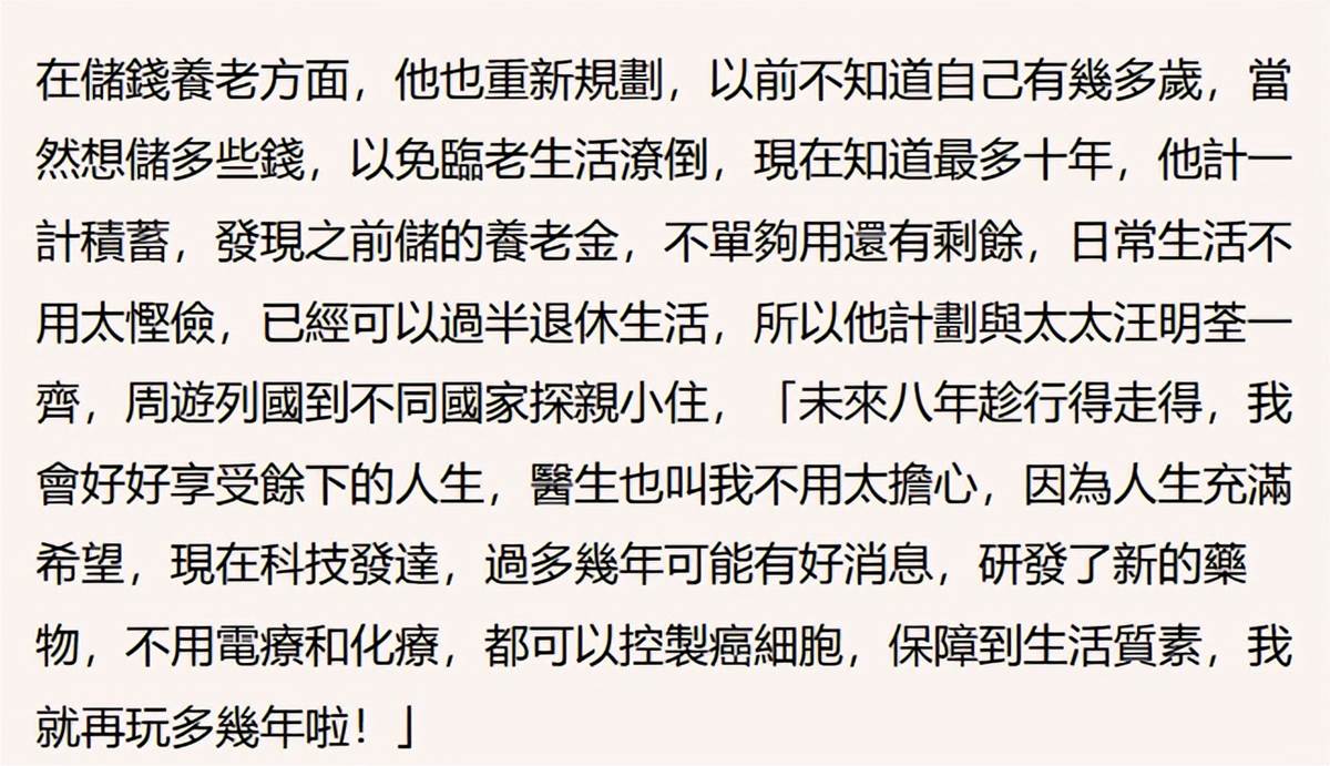 醫生還告訴他,不用太擔心,因為人生充滿希望,過幾年可能會研發新藥。