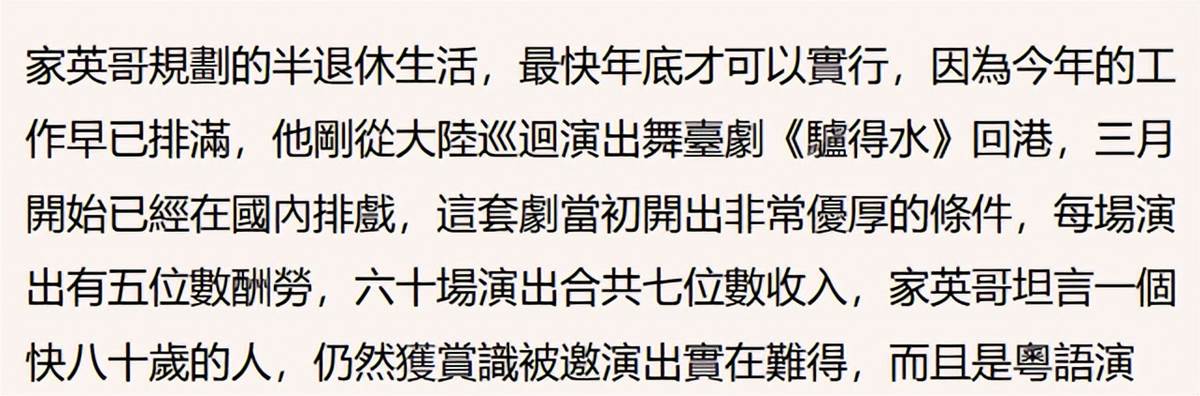 如果預期達標,8年時間要花掉近300萬(約合新台幣1110萬),換作普通家庭,根本無法想象,即便是中產階級也會被拖垮,不過羅家英不用擔心藥費,自曝今年第一次擔任舞台劇男主演,目前正在內地演出,每場片酬五位數,六十場可以收獲百萬,正好可以支付藥費。