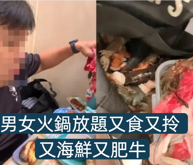 一對男女光顧一間火鍋放題店時涉將大批肥牛、生蠔及蝦蟹等食材放入環保袋企圖拿走,但其「又食又拎」行徑遭店舖閉路電視拍下,餐廳職員要求食客交出食材,但初時該食客只肯取出一袋裝滿海鮮的膠袋及一大把肥牛,其後在職員再三勸喻下,始將身旁整個環保袋交出,職員亦不禁驚訝道:「成袋呀?」