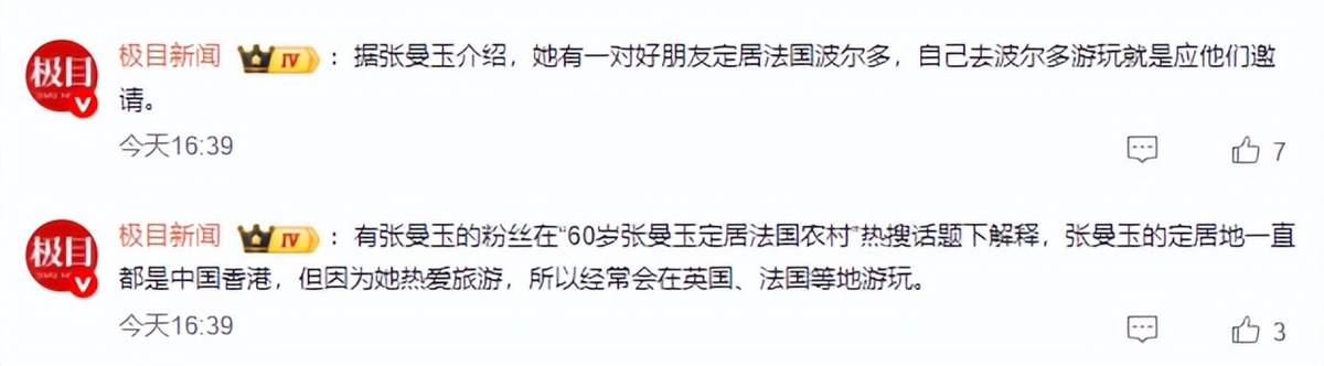 極目新聞也幫張曼玉發聲,稱張曼玉一直在香港定居,她去波爾多是受到朋友邀請,她的兩個好友都住在波爾多。