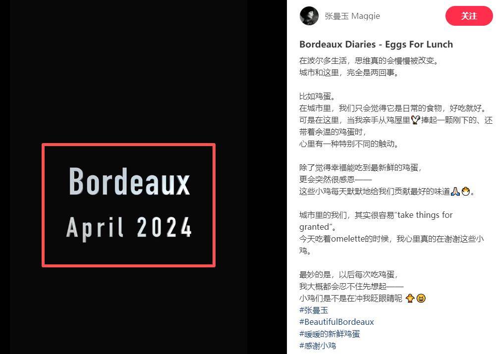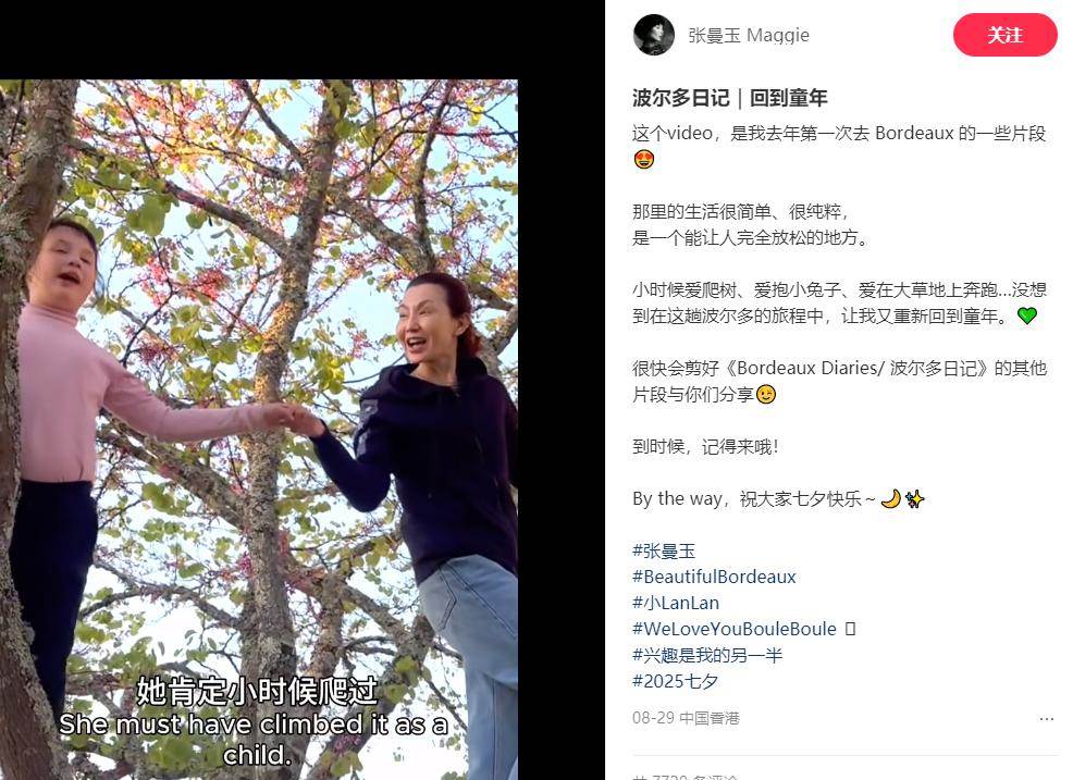 而且除了收雞蛋影片,張曼玉還分享了在波爾多的另一段影片,影片中她和小朋友們體驗爬樹,文中還寫到她會儘快剪輯出《波爾多日記》。