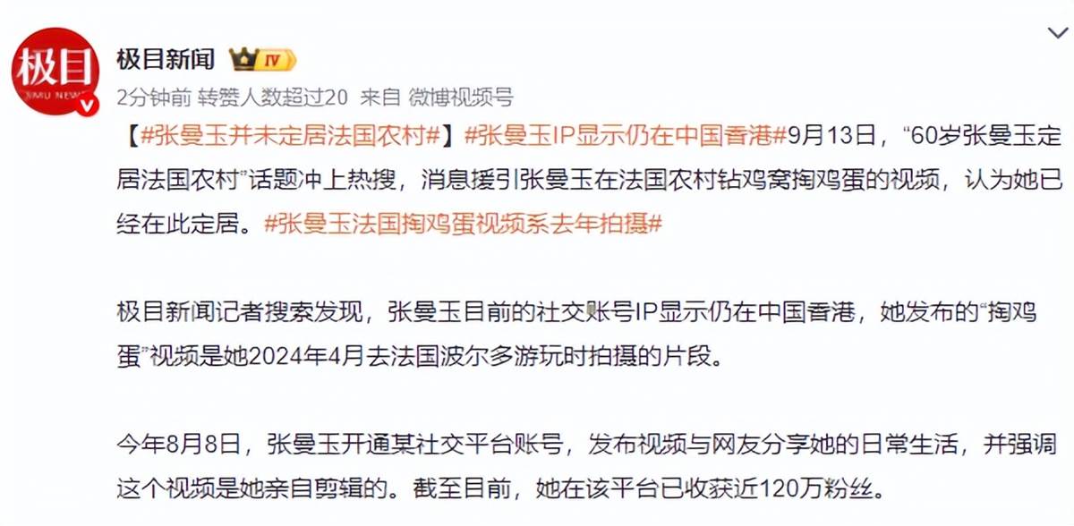 2天後,有人質疑張曼玉定居在法國農村,過上了養雞養鴨的田園生活,大明星跑到國外農村當農婦,身份的巨大轉變讓「張曼玉定居法國農村」上熱搜。