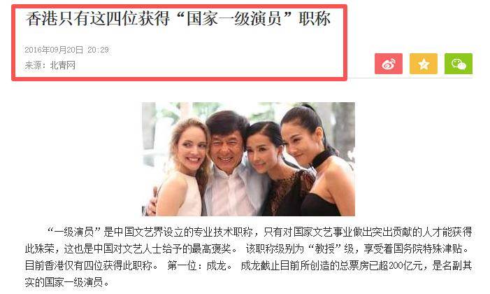 2016年,張曼玉和成龍、周潤發、梁朝偉一起被評為「國家一級演員」,在當時香港演員獲此殊榮的只有這四位。