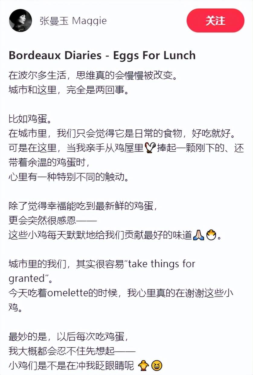 最先破防的就是廣大網友們,看到「張曼玉定居法國農村」的報導後,人們心裡不免有些疑問:同樣是農村,為什麼不待在自己的家鄉呢?難道國外的母雞蛋比國內的香?