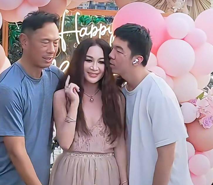 溫碧霞歡度59歲生日,當時16歲養子站在爸爸面前,身體微微往前要親吻溫碧霞的臉頰,沒想到爸爸這時候立刻伸手扯住兒子的後衣領,臉色也瞬間垮下,溫碧霞微笑有些僵住,讓養子站在自己另一側,試圖化解現場尷尬氣氛,最後養子只親吻她的頭髮拍下全家福。