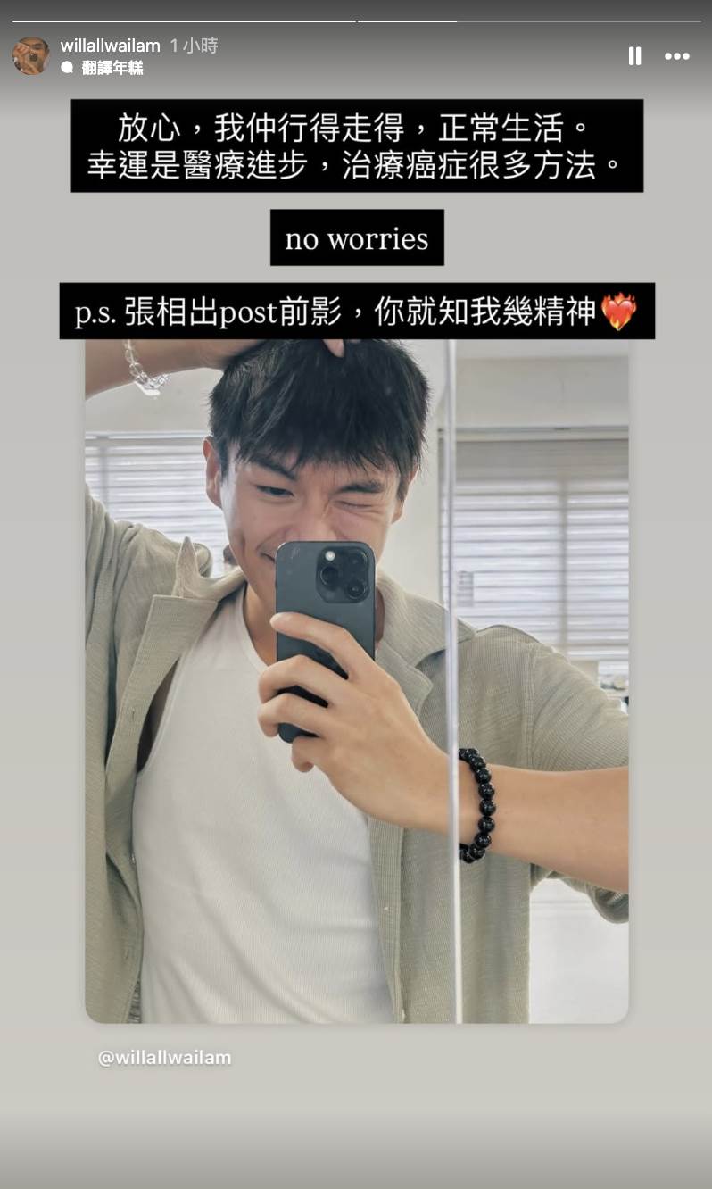 得知確診後他經歷了從否認、憤怒到最終接受的心路歷程,柯煒林坦言這個年紀罹癌,說心情不憂鬱不想幹譙天、幹譙全世界就是假的,甚至上網搜尋「如何接受自己患癌癥」,但最令他動容的是父親緊緊擁抱著他痛哭,質問為何不是自己得病,讓他知道要為愛自己、自己愛的人努力下去,希望身邊人看到他不要說加油,要微笑點頭,相信他會打贏逆境波!