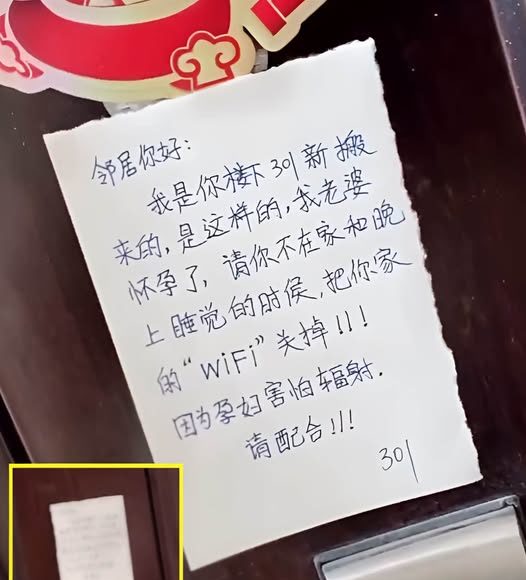 最近看到一個視訊,讓我忍不住想跟大家分享一下。視訊中,一個樓上樓下的鄰里小摩擦引發了熱議。樓下新搬來的鄰居因為家里有孕婦,貼了一張紙條,要求樓上晚上關掉WiFi,因為怕輻射對孕婦不好。如此「特殊」的請求遭到了樓上女子的回貼,而她貼上的文字直接讓事情迎來了交錯反轉,讓人不禁對她的回應感到好奇!這段視訊的后半段究竟發生了什麼呢?