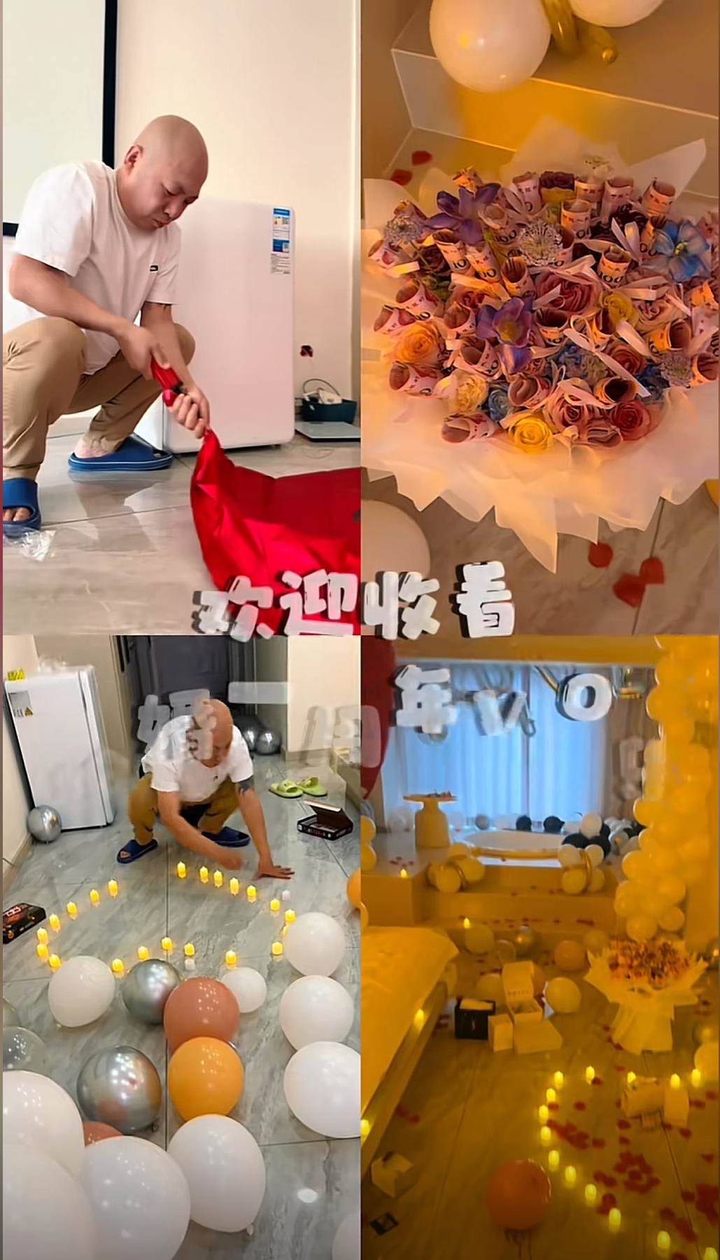 2025年4月30日,這天是老王和李麗結婚一周年的日子,為了慶祝這一天,老王可謂是花盡了心思。他把家里裝扮一番,在家里擺滿了氣球,然后又在主臥里用蠟燭擺了一個心型,然后用1萬元現金折了一個玫瑰花,送給李麗。