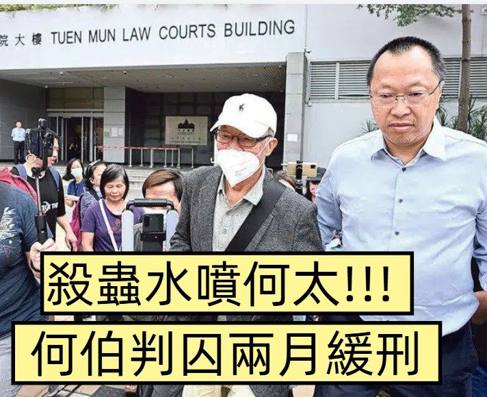 77歲「何伯」何煊,今年5月在港鐵兆康站用殺蟲水噴向與他爭執的女子,早前承認一項襲擊致造成身體傷害罪,昨日在屯門裁判法院被判囚兩個月,緩刑24個月。裁判官表示感化報告對何伯評價正面,考慮他無案底,「法庭畀次機會你」。涉案事主一度索償5萬元,裁判官經考慮後下令何伯賠償2000元。