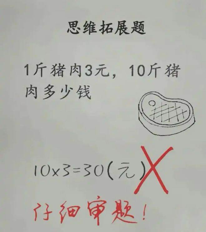 周五晚上,李媽媽發現兒子小浩的數學作業本上赫然打著一個紅叉,題目「一斤豬肉3元,十斤多少錢?」旁邊是孩子工整的答案「10×3=30元」。小浩委屈地說:「老師說我答錯了,可我想不明白…」李媽媽仔細檢查了幾遍計算過程,確認無誤后,決定周一一定要找老師問個清楚。