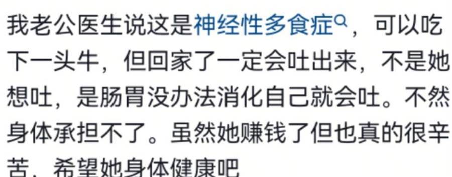 不過也有網友公布了她吃播的真相:神經性多食癥,這是一種進食障礙,可以吃很多,但事后回去一定會吐出來,因為腸胃被折騰的已經沒有消化功能。