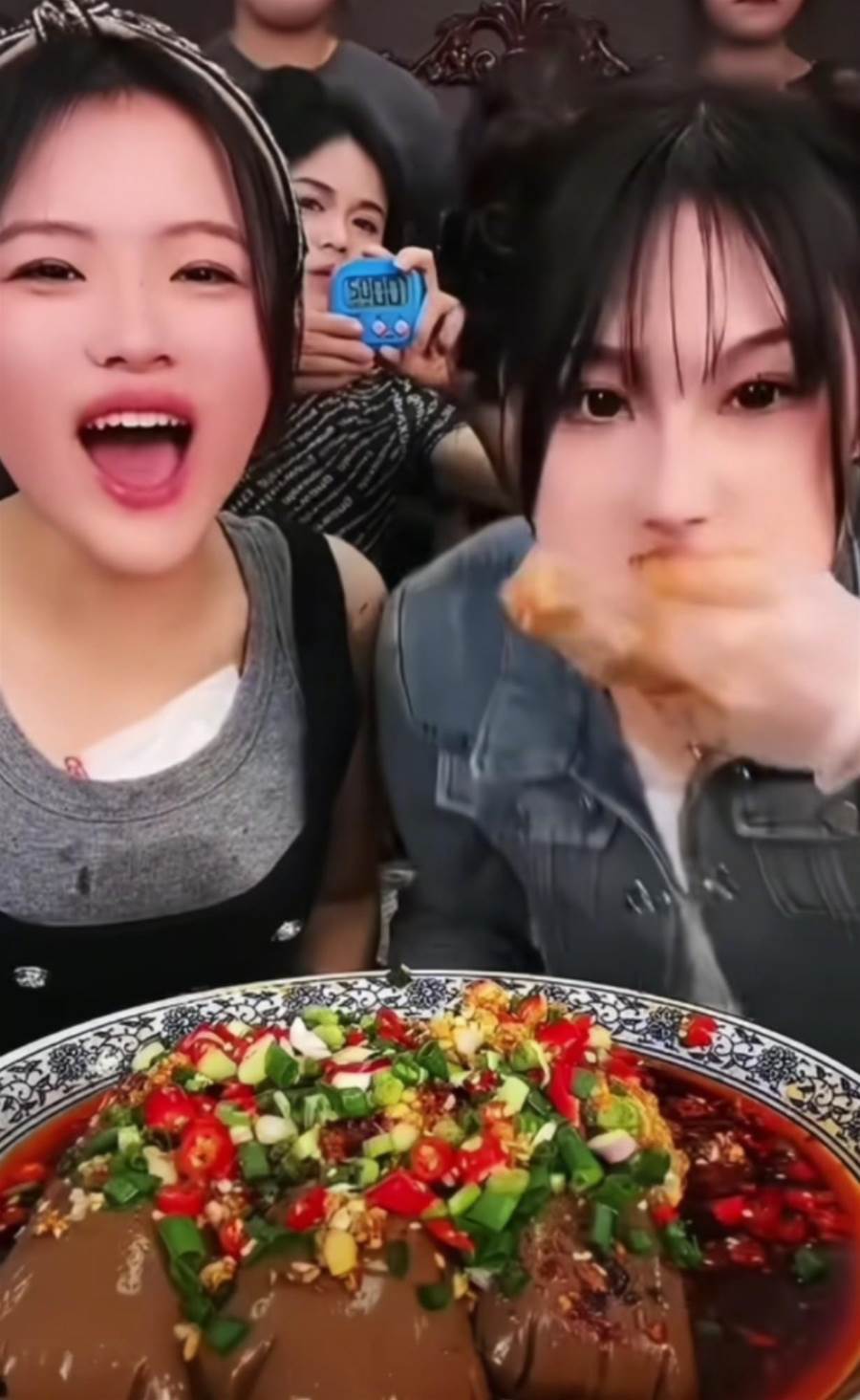 而這位博主已經連續直播6天,每天直播兩小時,每次吃掉的食物數十斤。