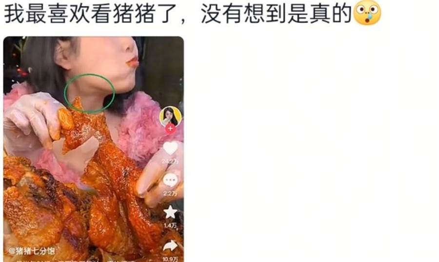 「豬豬七分飽」的視訊里,她一頓能吃1000根串串或者10斤小炒泡沫,有時候還挑戰半小時吃50個抄手。