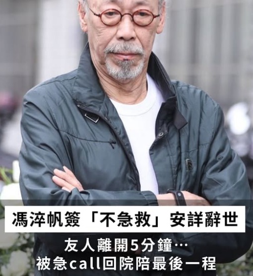 由於馮淬帆生前有簽「不急救同意書」,當晚他因血壓、血氧等生命指數下降,醫院只能做簡單「生命維持」,並不會有CPR或侵入性等更積極的治療手段。由於他未婚沒有子女,最終只能輾轉連絡上在香港的外甥,最後在外甥的請託下,幾位好友最後在醫院,陪伴馮淬帆走完成人生最後一程。