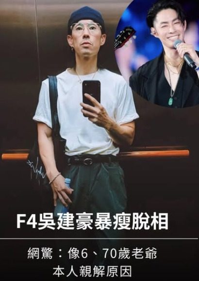 F4今年兩度在五月天演唱會上合體,獻唱《流星雨》掀起滿滿回憶殺,後續F3言承旭、周渝民、吳建豪也有成團再登演唱會計畫,然而熱愛健身的吳建豪,近日卻被發現「暴瘦脫相」,身材肌肉結實但明顯體脂過低,兩頰凹陷流失了膠原蛋白與臉部脂肪,讓粉絲大感驚訝「怎麼老了這麼多」、「年紀大了真的不能太瘦」、「男生也有斷崖式衰老,以為是6、70歲老爺」,吳建豪也親回粉絲留言,解釋:「瘦了還挺明顯,加上拍攝角度和死亡頂光。」