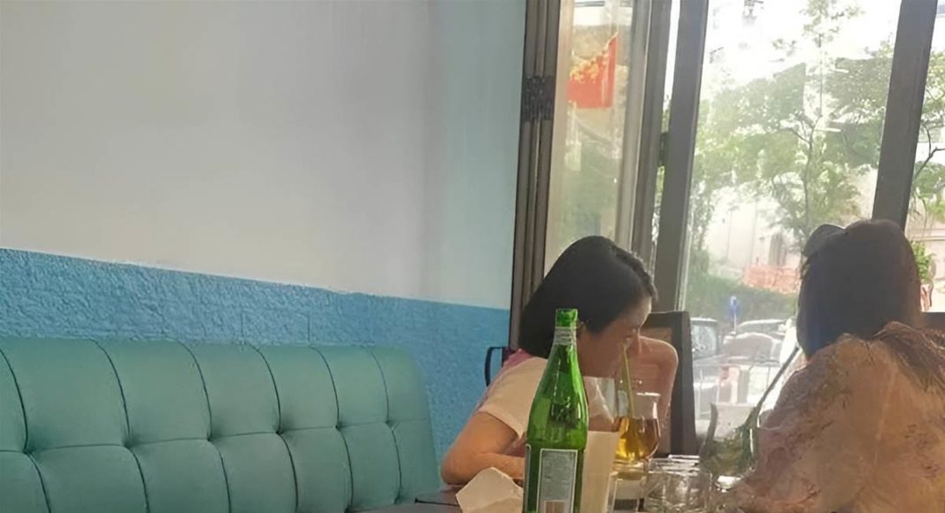 對面坐著一位女性,還放著好幾個啤酒瓶子,兩人相談甚歡。
