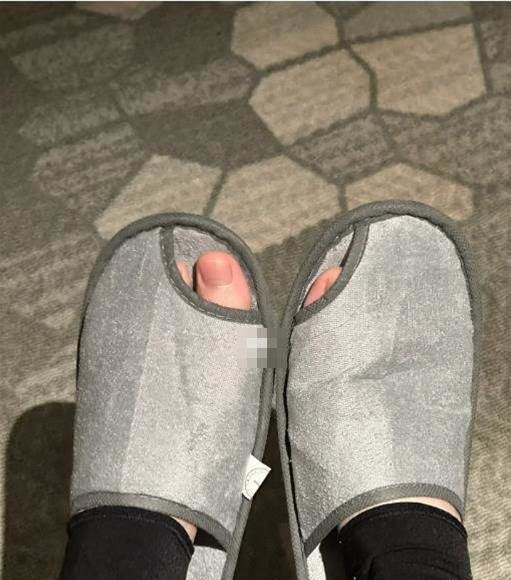 這名用戶在貼文中表示,自己入住飯店後,穿上房間裡的一次性拖鞋,卻發現兩隻拖鞋的前端各有一個洞,而且洞口的位置並不在正前方,而是一隻開在右邊,另一隻開在左邊。