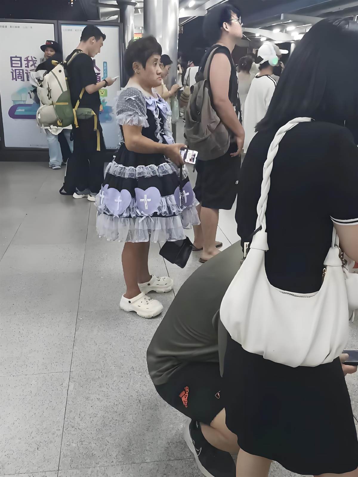 空氣中彌漫著一種無聲的集體審判,好奇、鄙夷、戲謔的目光像細針一樣從四面八方投射過來,聚焦在那位大媽身上。她顯然感受到了這不友好的氛圍,頭垂得更低,攥著袋子的手關節微微發白,但那身紫色的裙子,依然像一面倔強的旗幟。就在議論聲漸起,氛圍越來越尷尬時,一位站在大媽附近的中年男士似乎有些看不過去,他并非指責,而是帶著一絲好奇,溫和地問了一句:「阿姨,您今天這身打扮……是有什麼特別的活動嗎?」