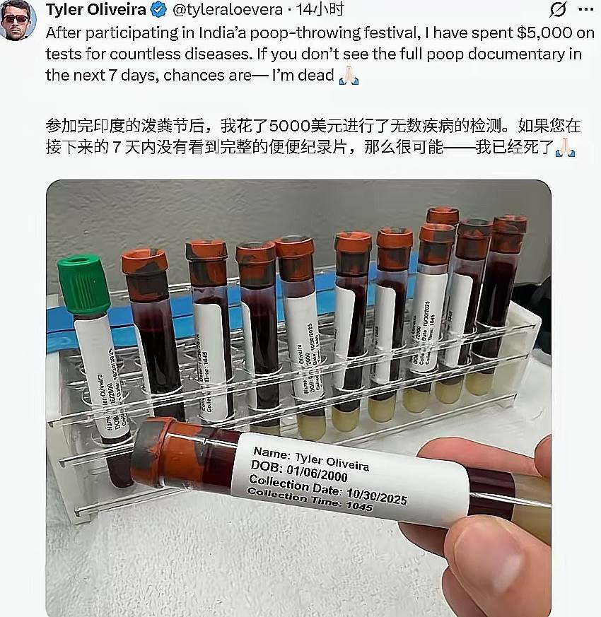男子挑戰「印度潑屎節」回來后「進醫院花15萬」崩潰回應:不知能否挺過7天