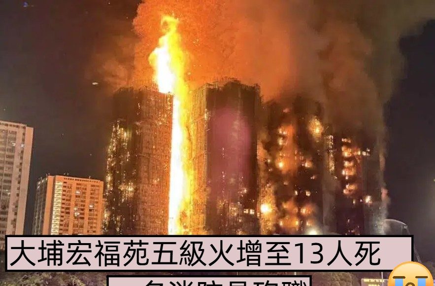 大埔宏福苑發生五級大火,消防共協助處理28名傷者,9人當場死亡、4人送院後不治,即13人死亡;另15人傷,其中6人傷勢嚴重。死者包括一名消防員。另有一名消防總隊目左腳受傷、一名消防員熱衰竭,正接受治理。