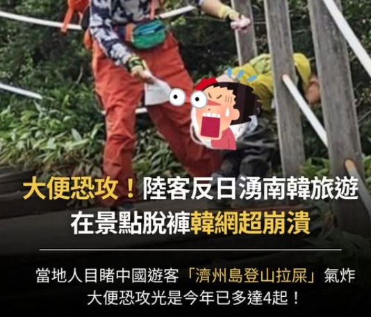 韓媒《朝鮮日報》報導,濟州島漢拏山國立公園的官方檢舉留言板最近出現一篇引發熱議的貼文,標題直指「如何處理在漢拏山隨地大便、又吵鬧喧嘩的中國人?」貼文者並上傳兩張照片,指出自己在城板嶽步道上親眼看到,一名疑似中國籍的女性竟要求年幼孩子直接在步道旁脫褲排便,事後僅擦拭便迅速離開,排泄物就留在現場。