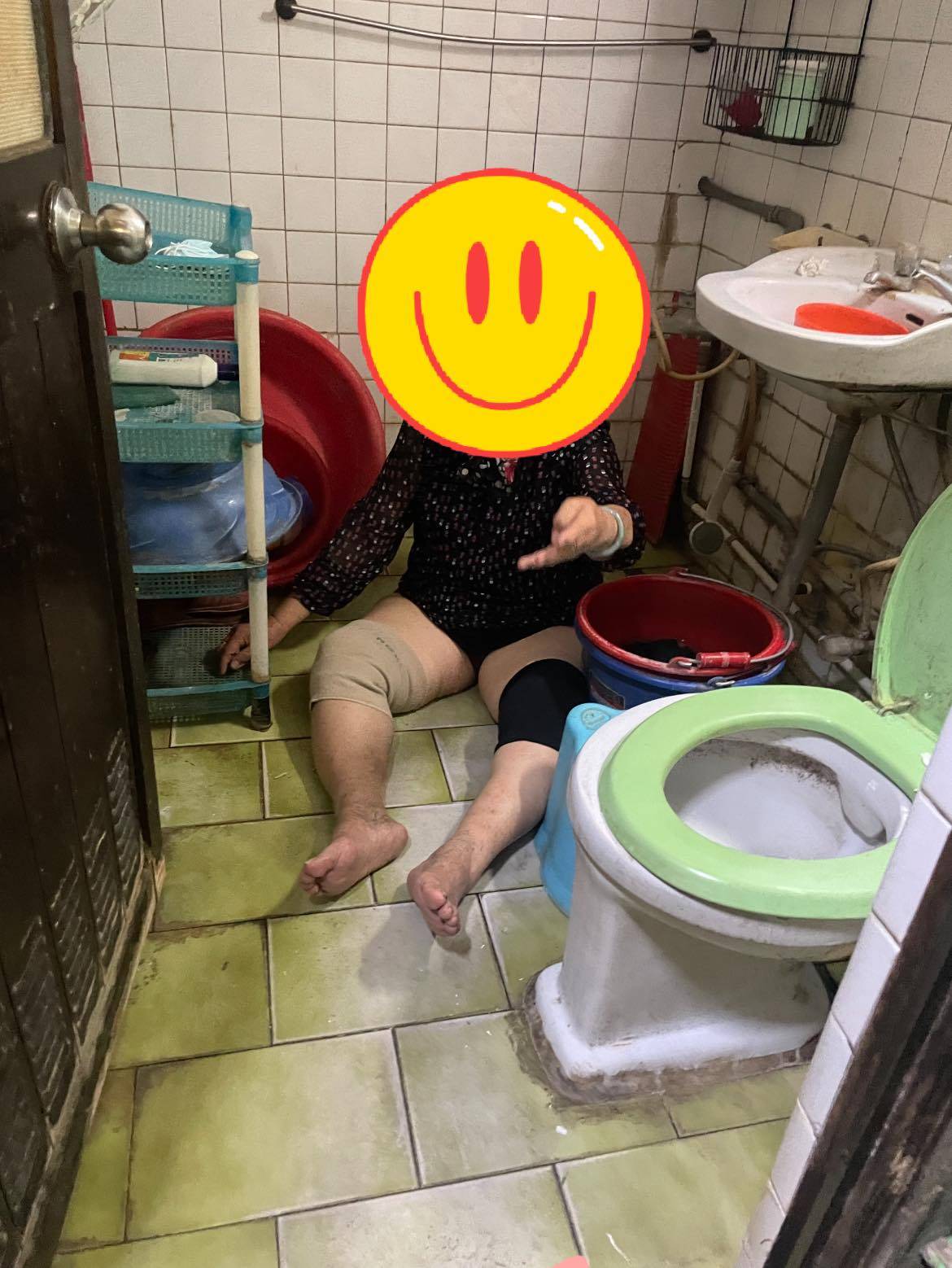 破窗進到屋裡之後,大家在浴室中找到了阿嬤,只見阿嬤倒臥于廁所地板上,褲子已經濕透,體力也非常差,精神上有些恍惚,看似已經累癱,基本表達都成問題,才讓眾人明白,看來阿嬤應該是獨自在家時不慎摔倒,在沒人攙扶的情況下無力站起來,才就這樣整整困在廁所兩天,所幸大家發現了她,才沒有造成更嚴重的後果。