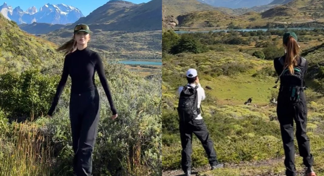 抵達智利后,吳千語帶著老公去徒步,夫妻倆坐著車到了當地的徒步聖地,白內國家公園,有山有水屬於高原地區,風景特別美,一邊徒步,一邊賞景,確實很舒服。