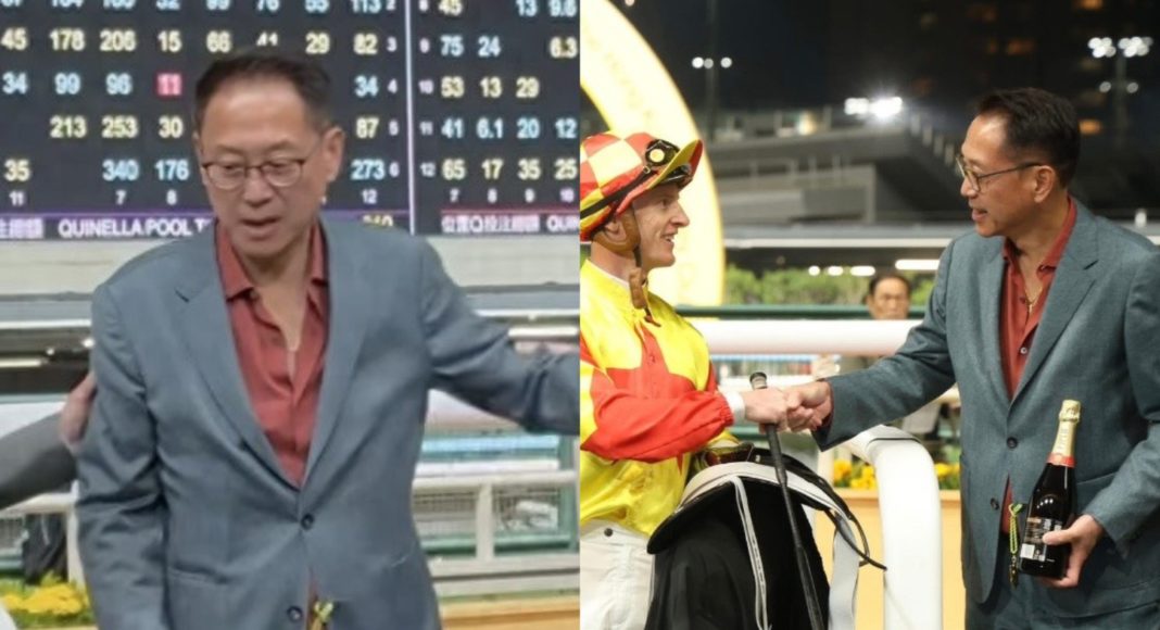 許晉亨如願以償地拉了頭馬,拿著香檳酒與騎師握手致意,還與同場人士相互擁抱祝賀,美中不足的是李嘉欣竟然不在場,否則夫妻倆必然是場內最閃耀的焦點。